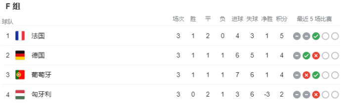 本届欧洲杯,拥有法国、德国、葡萄牙和匈牙利的F组被称为“死亡之组”,在这个小组中,法国头名,德国第二,葡萄牙第三,携手晋级16强,但葡萄牙和法国均倒在了1/8决赛,分别遭到比利时和瑞士淘汰。
