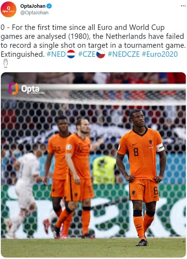 据统计,这是自1980年国际大赛开始有数据统计以来,荷兰首次在单场国际大赛比赛中0射正。