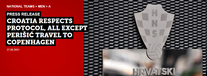佩里西奇被确诊新冠后,将隔离10天,而其他球员、工作人员和代表团成员无需隔离,他们都将前往哥本哈根,备战和西班牙的16强战。