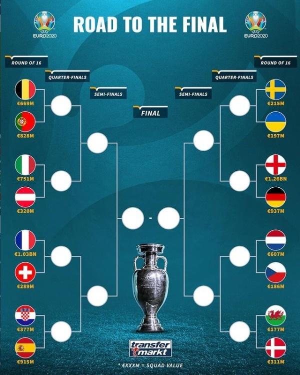来源:直播车06-27 11:08直播车讯 此前,欧洲杯16强在已经确定了对阵,德国转会市场也统计了各组对决的身价情况:
