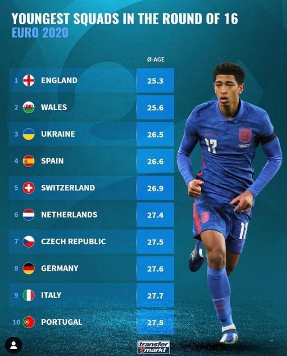 来源:直播车06-27 11:00直播车讯 昨晚,欧洲杯16强淘汰赛已经打响,此前德转市场统计了欧洲杯16强的平均年龄排行,英格兰队平均只有25.3岁是16支球队中最年轻的。