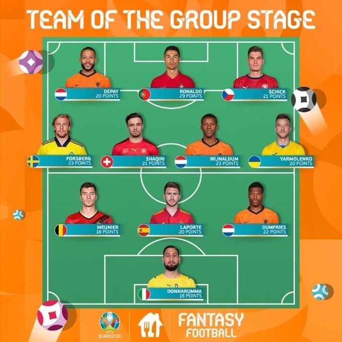 欧洲杯小组赛最佳阵容如下:
