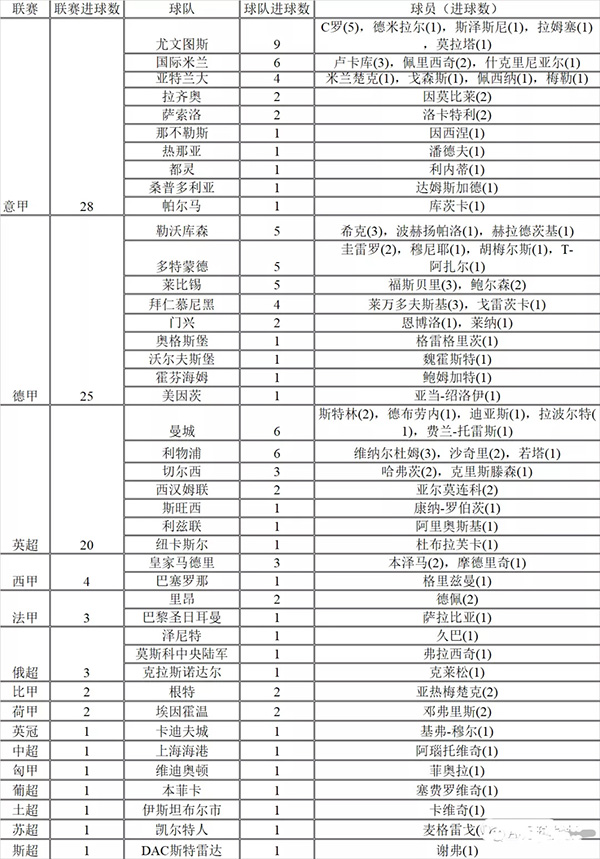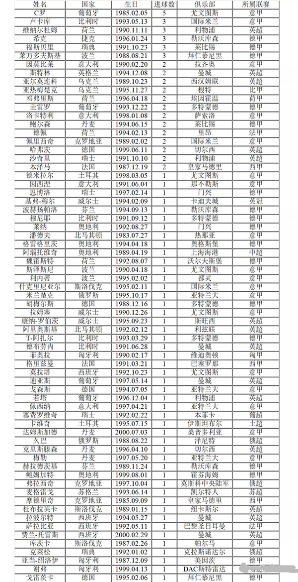 94个进球来自67个球员。这些球员一共来自15个联赛的42个俱乐部。其中C罗以5个进球位居射手榜首位。下面两张表分别从球员和联赛的角度展示了本届欧洲杯小组赛里的进球球员都来自哪些联赛和俱乐部(球员归属的俱乐部没有更新最新的转会信息,主要以该球员上赛季效力的俱乐部作为依据)。我们发现来自没落的意甲和只有一家独大的德甲的球员占据了小组赛一半以上的进球。人气极高的英超以20个进球位居第三。第四位是西甲,不过居然只有4个进球,分别来自巴萨的格里兹曼和皇马的莫德里奇还有本泽马。榜单里还有位来自中超上海上港的外援阿瑙托维奇。67个进球球员中年纪最大的是北马其顿的潘德夫, 对于综合实力一般的球队而言真的是家有一老,如有一宝。所以说球星,尤其是老球星的作用是不可替代的。奥地利的阿拉巴虽然不在射手榜上,但是助攻榜有他的一席之地。