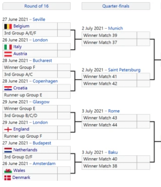 截止到23日,16强已经产生12队,分别是A组:意大利、威尔士、瑞士、B组:比利时、丹麦、C组:荷兰、奥地利、D组:英格兰、克罗地亚、捷克、E组:瑞典、F组:法国。已经确定的1/8决赛对阵是意大利对阵奥地利,威尔士对阵丹麦,其余6组对决还有待确定。