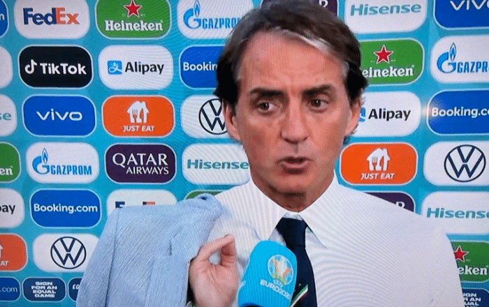 曼奇尼在赛后接受采访的时候细节也很不错,他将西服挂在肩上,确实非常帅气,还有非常抢镜的手指,就好像是做出了一个“ok”的动作一样,可见现在的曼奇尼真的是心情大好。