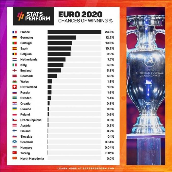 来源:直播车06-20 15:31直播车讯 据Stats Perform模型预测,法国依然是欧洲杯冠军的最大热门。