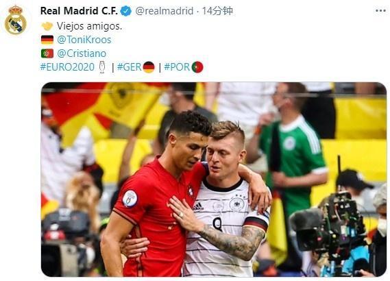 欧洲杯小组赛第二轮,德国4-2击败葡萄牙,德国阵中的克罗斯和葡萄牙阵中的C罗曾在皇马共事多年,皇马官推赛后晒出两人合影并配文:“老朋友。”
