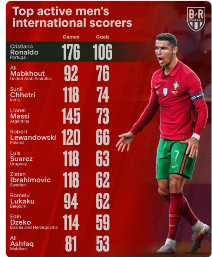 如图,C罗是国家队进球数量最多的球员,他176场国家队比赛打进106球。而排名第二的是阿联酋球星马布霍特,他代表国家队出场92次,打进76球,可以说他的效率比C罗还要高。而排名第三的是印度前锋切特里,他118场国家队比赛打进74球。而排名第四的才是梅西,他145场国家队比赛打进了73球。当然,目前梅西在参加美洲杯,他很有可能在今夏上升到第二的位置。