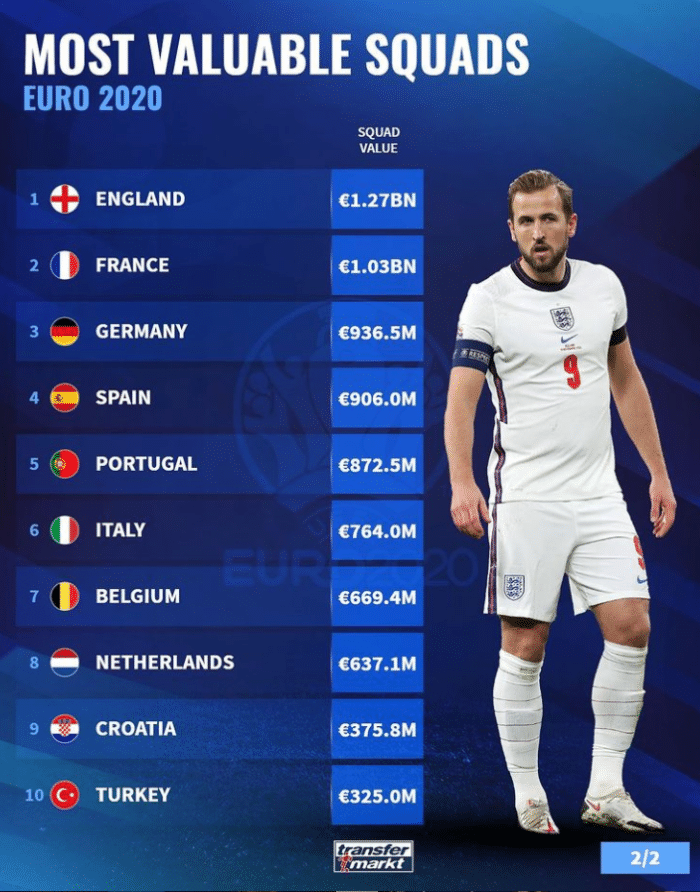 来源:直播车06-08 11:51直播车讯德国转会市场今日盘点了欧洲杯参赛球队的身价,英格兰以12.7亿欧元位居第一,法国和德国则紧随其后。