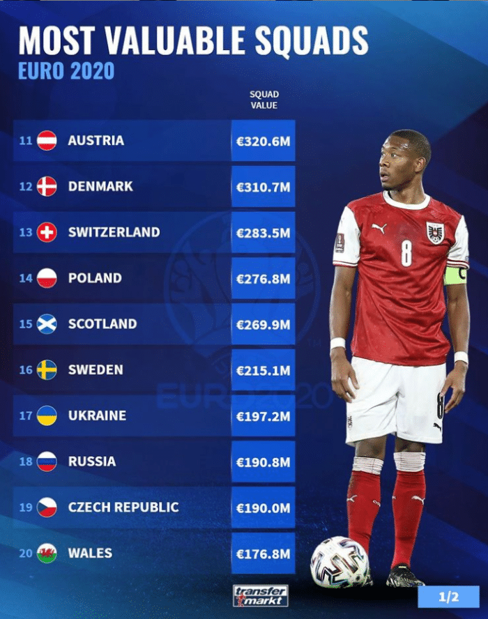 德转盘点欧洲杯各队身价:英格兰12.7亿欧第一