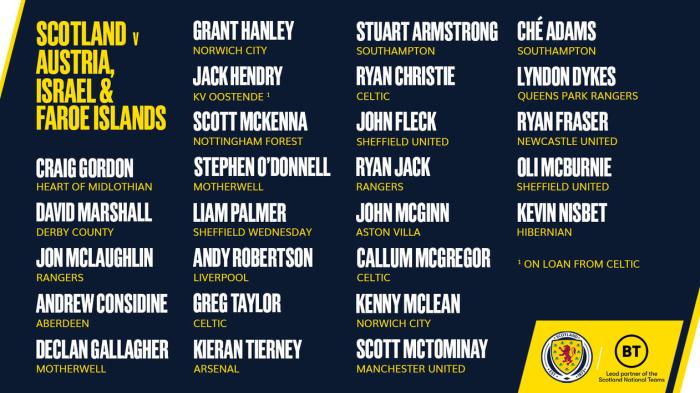 苏格兰欧洲杯大名单: 蒂尔尼、麦克托米奈领衔