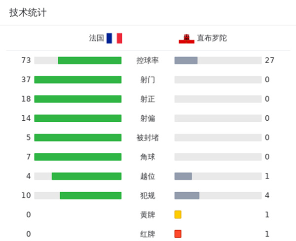 来源:直播车11-19 06:23 直播车讯 :北京时间11月19日凌晨3:45,欧洲杯预选小组赛第9轮,法国主场对阵直布罗陀。上半场比赛,法国队进攻如水银泻地,小埃梅里进球后伤退离场,法国队多点开花,六人取得进球的同时还造了对手一个乌龙,直布罗陀队员桑托斯吃到红牌。半场结束,法国7-0领先;下半场,法国继续围歼直布罗陀,法国队再进七球,姆巴佩完成帽子戏法,吉鲁梅开二度。最终法国14-0血洗直布罗陀,刷新国家队历史最大分差。
