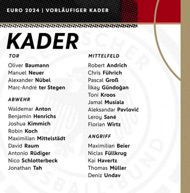 直播车讯 今天德国足协公布了德国队27人的欧洲杯初选名单,各俱乐部球员分布如下: