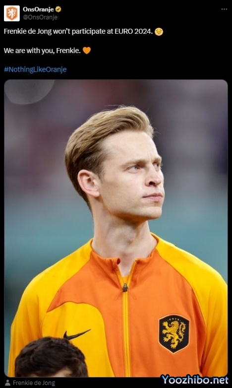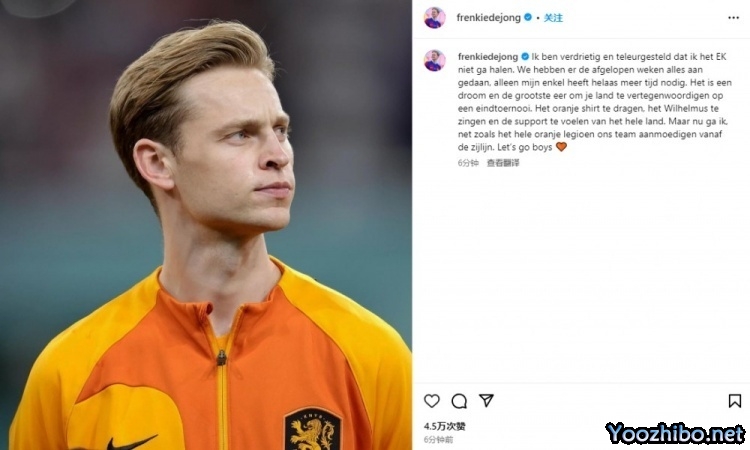 来源:直播车06-11 12:14直播车讯 北京时间6月11日,荷兰男足国家队官方宣布,27岁的巴萨中场弗兰基-德容因脚踝伤势无法及时恢复,将缺席今夏的欧洲杯。而随后,德容本人也在社媒予以确认。