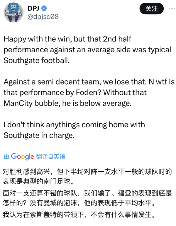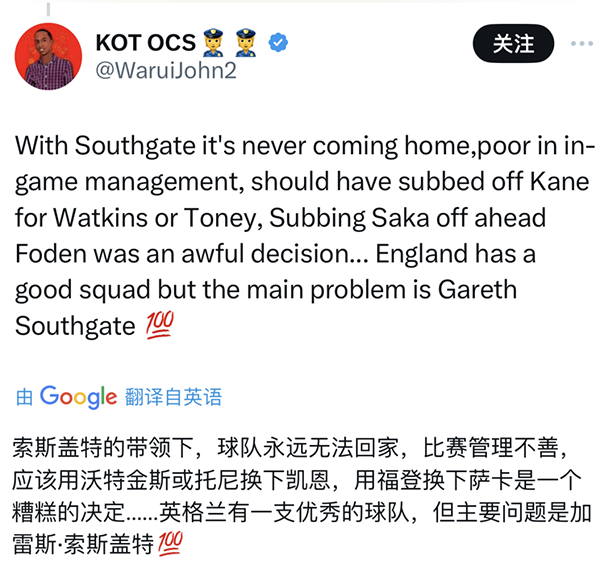 1场比赛能同时用废拜仁、阿森纳、曼城和利物浦这4大豪门的“进攻大腿”,索斯盖特确实令人大跌眼镜。赛后不少愤怒的英格兰球迷在官推下面留言怒斥:“下一场就该解雇他!”:“有索斯盖特在,英格兰永远都不会有作为!”:“有这样的主帅,足球永远无法回家!”