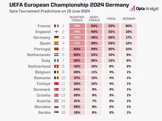 直播车讯 欧洲杯小组赛首轮比赛结束,OPTA预测欧洲杯夺冠概率: