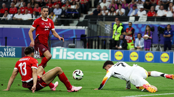 来源:直播车06-24 11:50直播车讯 北京时间6月24日,欧洲杯A组迎来大结局,德国队和瑞士正面交锋,争夺小组第一,上半场,安德里希远射破门被吹,恩多耶抢点破门为瑞士队取得领先,如果瑞士队1-0击败德国队的话,那么他们将排名小组第一。到了比赛最后时刻,替补出场的菲尔克鲁格补时绝平,也为德国队重新夺下小组第一,这样A组的德国队小组头名晋级,瑞士队排名小组第二。