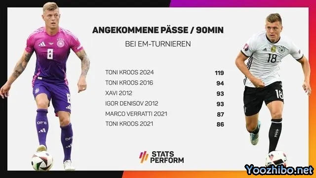 来源:直播车06-25 16:08直播车讯 根据统计,现年34岁的托尼-克罗斯本届欧洲杯小组赛前两轮平均每90分钟能够为队友送出119脚传球,在欧洲杯历史上所有出场至少150分钟的中场球员里,这样的数据排名第一。