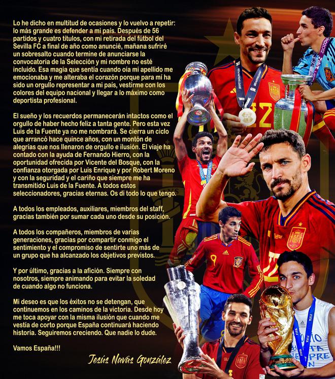 他在社交媒体上写道:“最伟大的荣誉就是为我的祖国效力。在为国家队出战56场比赛并赢得4个冠军之后,随着我宣布将在年底从塞维利亚俱乐部退役,明天当国家队大名单公布时,看到我的名字不在其中,我会感到一阵失落。”