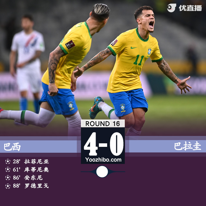 直播车2月2日讯 北京时间2月2日8:30,卡塔尔世界杯南美预选赛第16轮巴西主场迎战巴拉圭的比赛。上半场拉菲尼亚闪击被吹后低射破门,半场战罢,巴西1-0巴拉圭。下半场拉菲尼亚中柱,库蒂尼奥远射世界波破门,安东尼、罗德里戈替补再进两球,最终巴西4-0大胜巴拉圭保持不败。