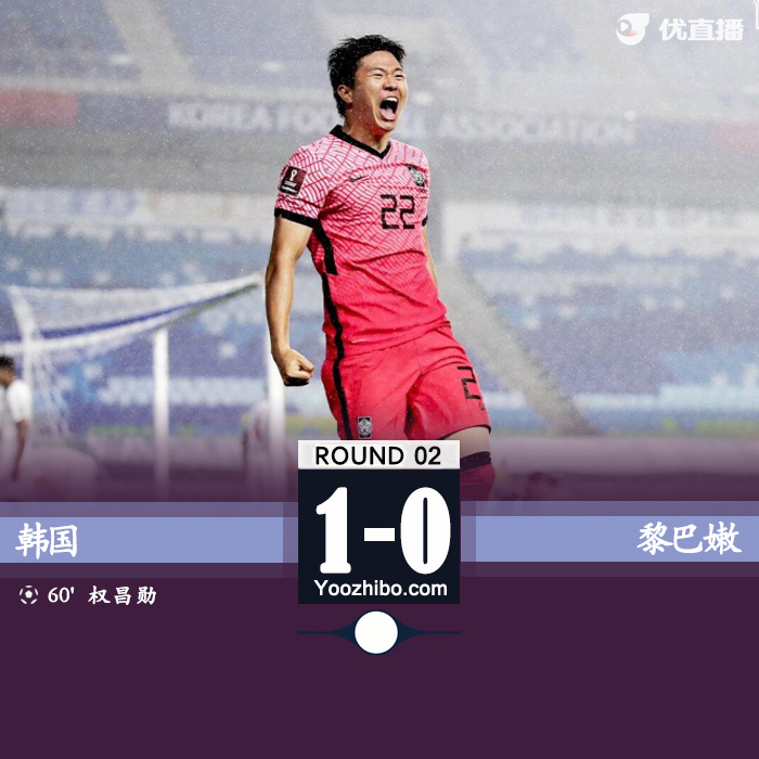 直播车9月7日讯 北京时间9月7日19:00,世界杯预选赛亚洲区12强赛继续进行,韩国对阵黎巴嫩。上半场,韩国队占据绝对优势,但没能取得进球;下半场,黄喜灿助攻权昶勋破门。最终,韩国1-0战胜黎巴嫩,迎来12强赛首胜,下一场将对阵叙利亚。