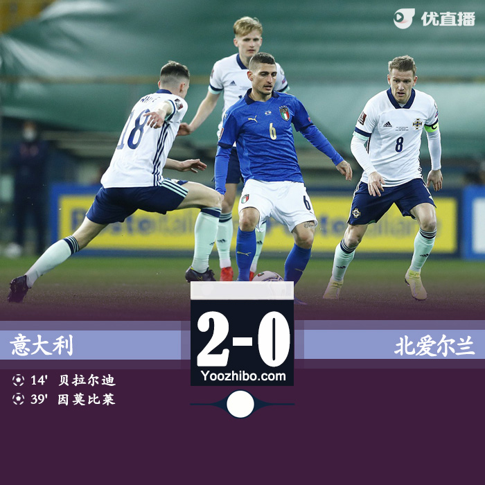 直播车3月26日讯 北京时间3月26日3点45分,世预赛欧洲区C组意大利主场迎战北爱尔兰。上半场贝拉尔迪和因莫比莱各入一球,下半场两队再无建树,最终意大利主场2-0击败对手。