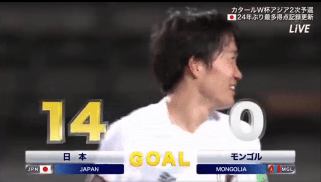 然而,中国球迷并不买账,因为日本男足在几个小时之后就用“14球大胜”刷新了大家的认识。在世预赛亚洲区40强赛F组的一场比赛中,日本男足迎来蒙古男足的挑战。凭借大迫勇也“帽子戏法”、稻垣祥和古桥亨梧“梅开二度”,以及、镰田大地、守田英正、伊东纯也、浅野拓磨联袂的进球,再加上蒙古球员的“自摆乌龙”。最终,日本男足以14比0击败了蒙古男足。值得一提的就是,日本男足这一次攻入的14球,是1967年15比0击败菲律宾之后最大的比分。如今,日本男足在小组当中获得“五连胜”,积15分攻入27球排名F组的头名,基本锁定晋级“12强赛”的名额。
