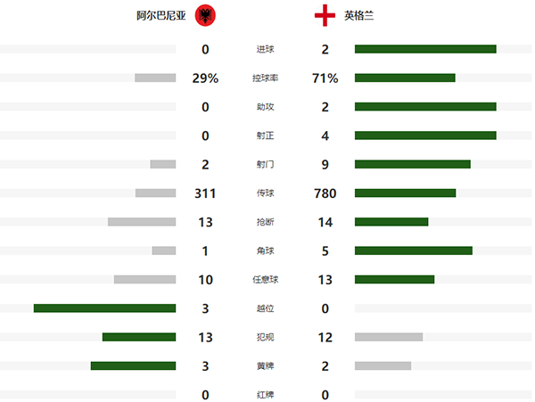 全场比赛结束,英格兰2-0完胜阿尔巴尼亚,积6分暂列小组榜首。
