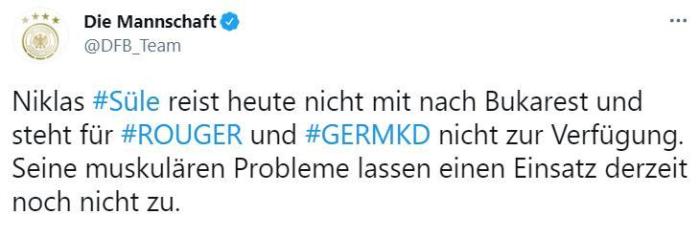 德国队官方: 聚勒因伤缺席后两场世预赛