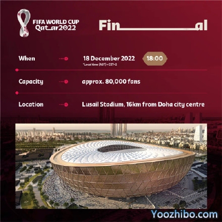 决赛地点为卢萨尔体育场(Lusail Stadium),该场地能够容纳8万名观众现场观赛;决赛时间为北京时间12月18日23:00。