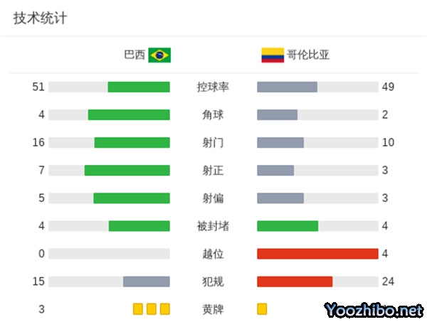 拉菲尼亚主罚点球骗过门将将球打进,巴西1-0哥伦比亚。