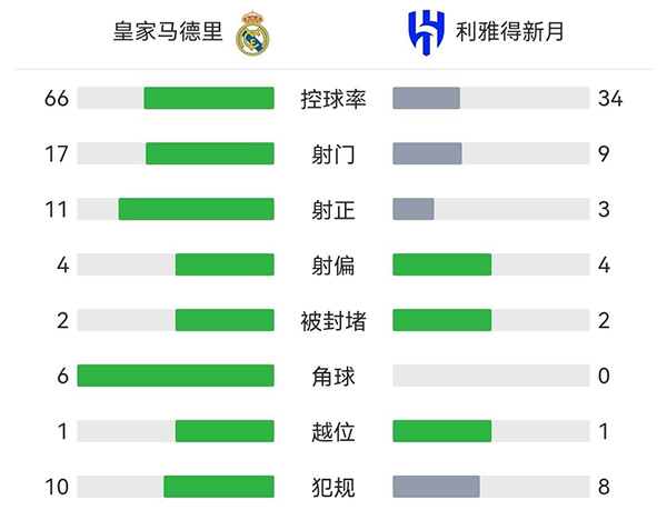 全场比赛结束,最终皇家马德里5-3战胜利雅得新月。
