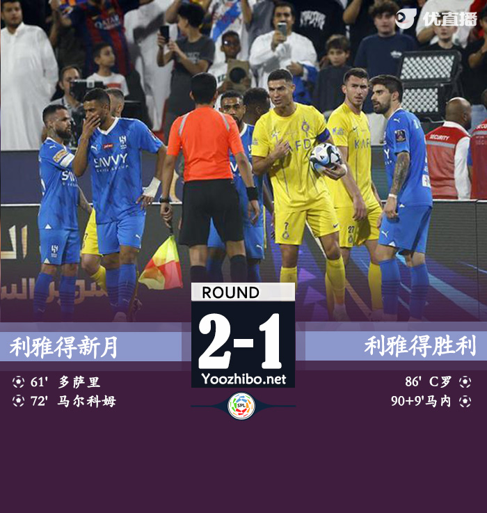 直播车讯:北京时间4月9日沙超杯半决赛,利雅得新月主场对阵利雅得胜利。上半场奥斯皮纳连续做出关键扑救,C罗连续多脚打门造险,下半场达瓦萨里首开记录,马尔科姆头球破门,C罗染红离场,马内最后时刻扳回一球。最终比分利雅得新月2-1利雅得胜利。