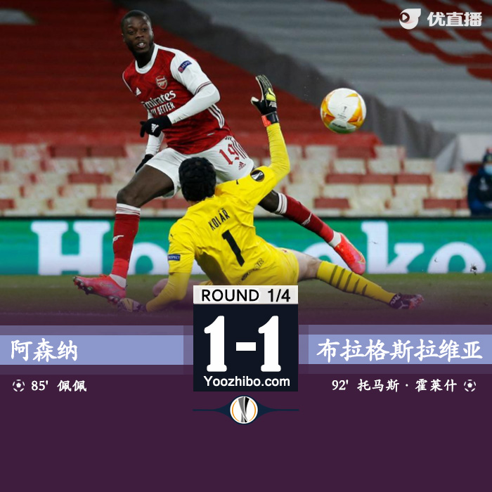 直播车4月9日讯 北京时间04月09日星期五03:00,欧联杯1/4决赛首回合阿森纳迎战布拉格斯拉维亚。上半场,枪手没有创造出明显进球机会,阿森纳半场暂0-0布拉格斯拉维亚。下半场,威廉任意球中柱,拉卡泽特超级单刀中框,佩佩替补登场破门,霍尔斯头球读秒绝平。最终,阿森纳主场1-1斯拉维亚。