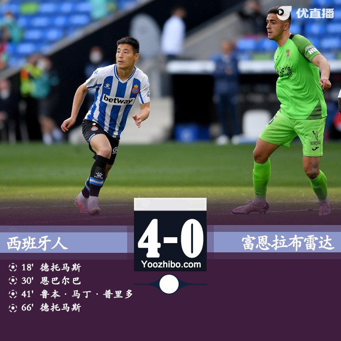 直播车4月2日讯 北京时间4月1日23:00,西乙第32轮,西班牙人主场迎战富恩拉布雷达。上半场,德托马斯造点并亲自主罚命中,恩巴尔巴劲射扩大优势,达德尔造乌龙;下半场,武磊第57分钟替补登场,德托马斯双响。最终,西班牙人4-0击败富恩拉布雷达,继续领跑积分榜。