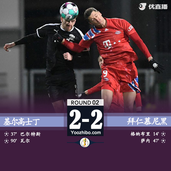 直播车讯 北京时间1月14日凌晨3时45分,德国杯第二轮打响,拜仁对阵德乙球队基尔。第14分钟,格纳布里为拜仁首开纪录,第37分钟基尔由巴特尔斯反击扳平比分。易边再战,第47分钟萨内任意球直接破门,补时第3分钟瓦尔头球绝平。加时赛双方均未能完成进球,点球大战中双方前5罚均命中,罗卡罚丢第6粒点球。最终,拜仁总比分7-8不敌基尔,止步德国杯次轮。