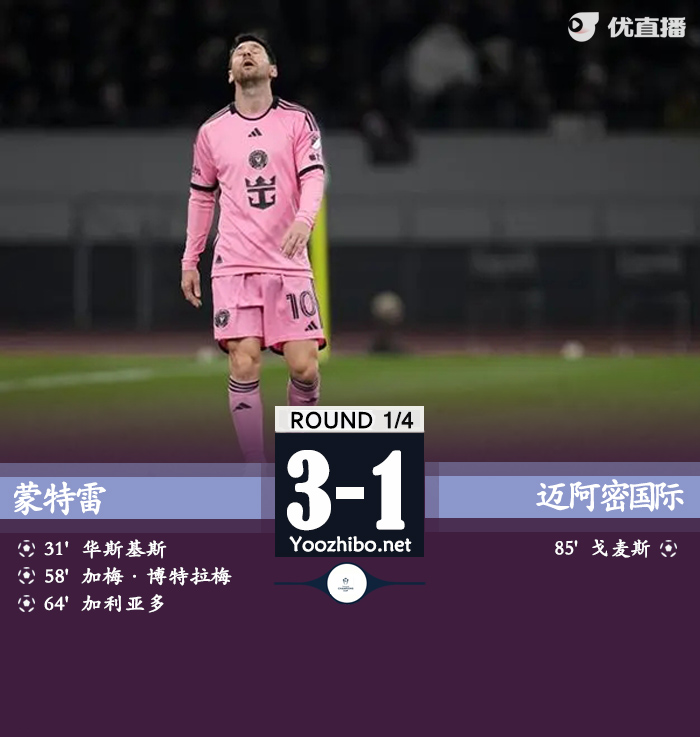直播车讯:北京时间4月11日美冠杯1/4决赛次回合,蒙特雷主场对阵迈阿密国际。比赛第31分钟,卡伦德超巨失误,巴斯克斯率先得分,第58分钟,贝尔泰拉梅世界波再下一城,第64分钟,蒙特雷前场断球,加利亚多头球得分,第78分钟,阿尔巴踩踏对手吃到第二张黄牌被罚下场,第85分钟,梅西助攻迭戈-戈麦斯扳回一城。最终比分蒙特雷3-1迈阿密国际。两回合总比分蒙特雷5-2迈阿密国际。