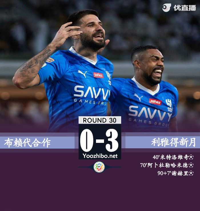 直播车讯:北京时间5月3日23:00,沙特联第30轮,利雅得新月客场对战布赖代合作。上半场,迈克尔传中球送上助攻,米特洛维奇头球破门助新月取得领先;下半场,米林科维奇助攻阿卜杜勒哈米德破门锁定胜局,谢赫里补时再下一城。最终,利雅得新月3-0击败布赖代合作,29战27胜2平积83分,以12分优势领跑积分榜,布赖代合作积51分位列第四位。