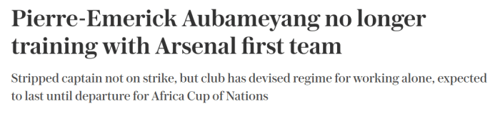 《电讯报》表示,非洲杯将于1月9日在喀麦隆开幕,在启程前往非洲杯前,奥巴梅扬不会再参加任何一场阿森纳的比赛,也不会再和阿森纳一线队一起训练。至于他的未来,将在非洲杯结束后由阿尔特塔评估。