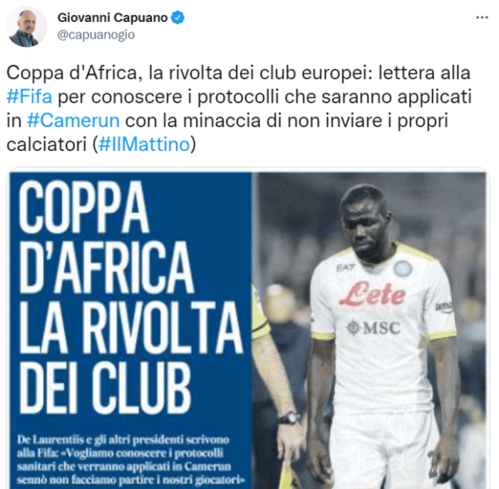 来源:直播车12-17 10:10直播车12月17日讯 据记者GiovanniCapuano报道,有一些欧洲俱乐部致信国际足联,威胁不放球员参加非洲杯。