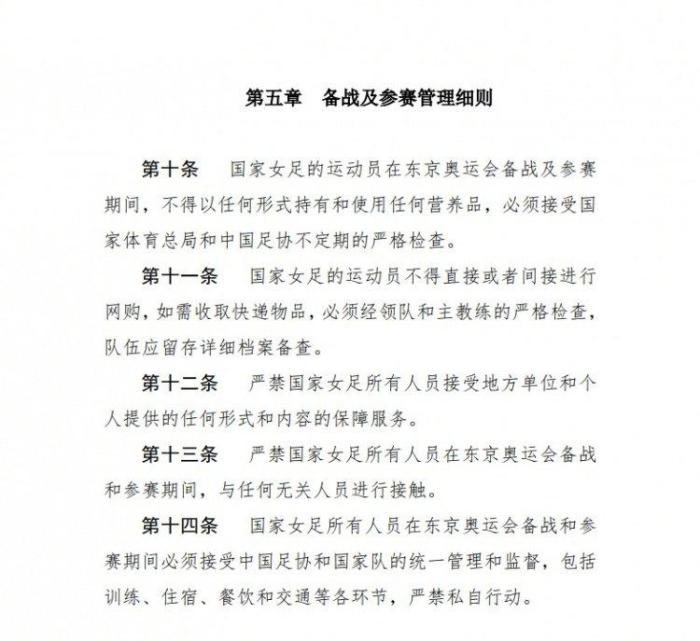 管理办法规定:国家女足的运动员在#东京奥运会#备战及参赛期间,不得以任何形式持有和使用任何营养品,必须接受国家体育总局和中国足协不定期的严格检查。同时国家女足的运动员不得直接或者间接进行网购,如需收取快递物品,必须经领队和主教练的严格检查,队伍应留存详细档案备查。