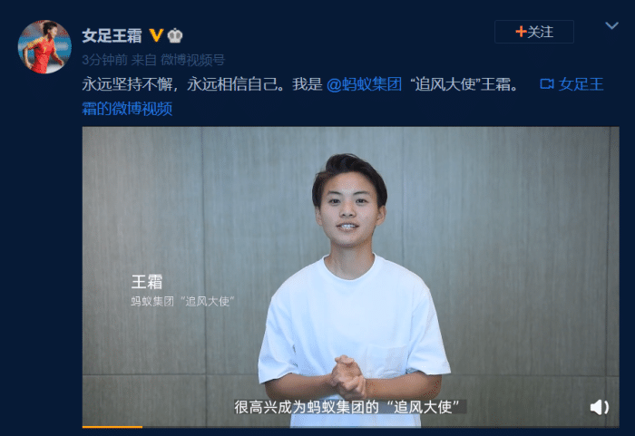 王霜在个人社交媒体上宣布成为蚂蚁集团“追风大使”