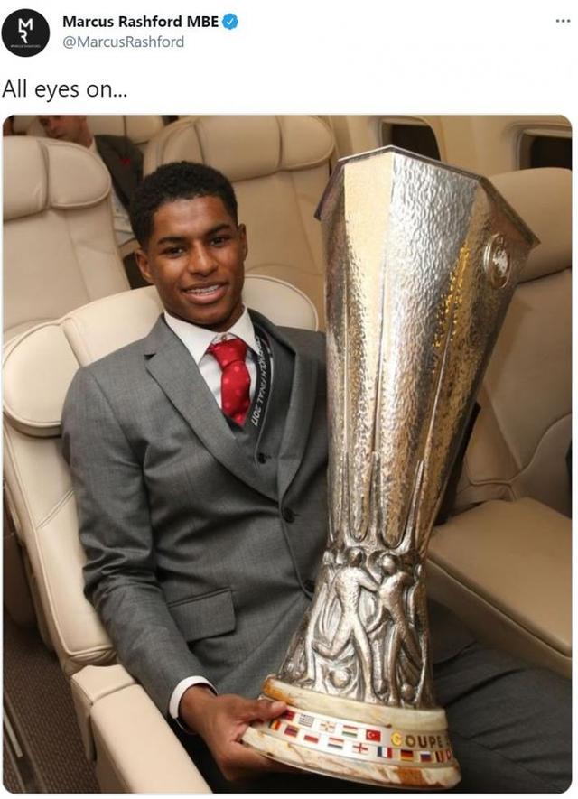 拉什福德晒出自己数年前赢得欧联杯时手捧冠军奖杯的照片,并写道:“所有目光聚焦于……”