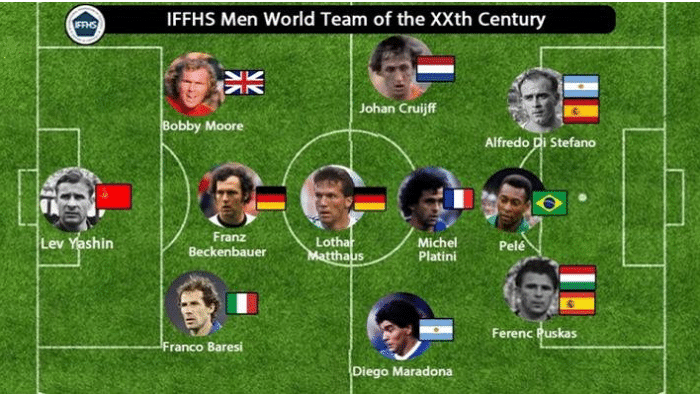 如图,男足的最佳阵容是一个343阵容,其中门将位置上是前苏联门神雅辛,后防线上分别是前英格兰国脚博比摩尔、前德国国脚贝肯鲍尔和前意大利国脚巴雷西。中场方面分别是前德国国脚马特乌斯,前阿根廷国脚马拉多纳、前意大利国脚普拉蒂尼和前荷兰国脚克鲁伊夫。前锋位置上分别是前巴西国脚贝利,前匈牙利国脚普斯卡什和前西班牙国脚迪斯蒂法诺。