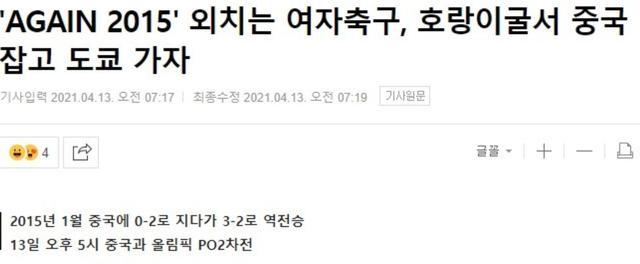 直播车4月13日讯 韩国媒体Naver今日撰文评论了接下来中国女足和韩国女足的比赛,他们表示韩国女足可以像2015年一样逆转中国女足。