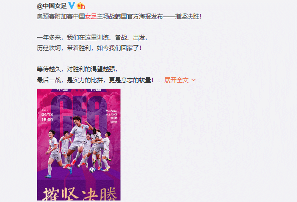 就在今天中午,中国女足发布了次战的海报,主题是“摧坚决胜”,海报居中的是首回合斩获关键进球庆祝的王霜,还有王珊珊等人。这场比赛对于中国女足来说意义不言而喻,所以一定要“摧坚决胜”。