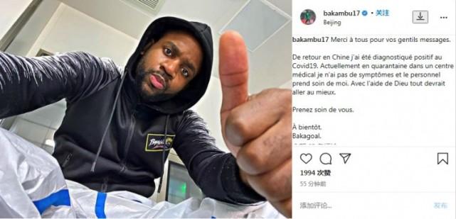 来源:直播车03-05 20:50直播车讯 北京时间3月5日凌晨,效力于中超豪门北京国安的外援巴坎布,在个人社交账号上发布消息,表示自己感染了新冠,目前正在接受隔离。巴坎布写道:“我在中国接受了检测,结果显示为阳性。目前我正在医疗中心接受隔离。我没有症状,有医院的员工看护着我。上帝保佑,目前一切都好。”