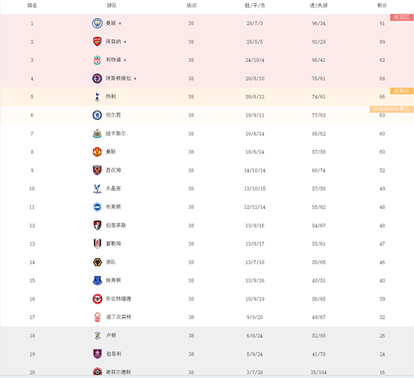来源:直播车05-20 15:57直播车讯 北京时间5月20日,英超第38轮也是最后一轮结束争夺,最终曼城夺冠,力压阿森纳,利物浦获得季军,曼联无缘欧战,森林队压哨保级成功,降级的队伍已经出炉。接下来我们一起来看看英超最终排名: