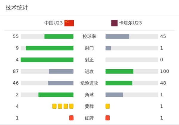 卡塔尔U23首发:1-优素福-巴利德、4-穆罕默德-艾亚什、11-阿卜杜勒拉赫曼-朱马、13-阿卜杜拉-阿拉利、15-贾西姆-阿卜杜勒萨拉姆、6-乌萨马-塔伊里、18-穆斯塔法-马沙勒、19-纳比勒-伊尔凡、9-塔米姆-阿卜杜拉、16-穆罕默德-苏拉杰、20-艾哈迈德-拉维