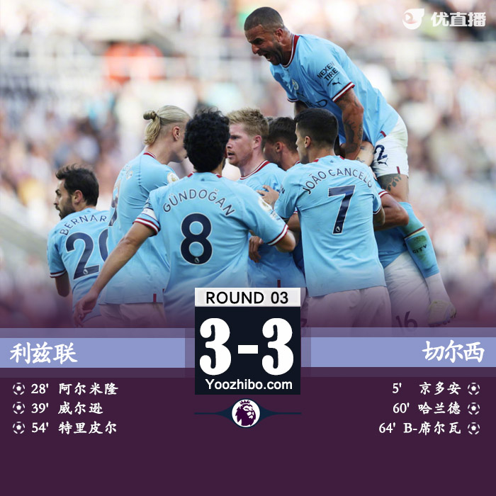 直播车讯北京时间8月21日23点30分,英超第3轮曼城客场挑战纽卡斯尔。上半场,京多安闪击破门,曼城攻势占优,波普多次贡献扑救,阿克伤退,圣马连续助攻阿尔米隆和威尔逊完成反超。下半场,哈兰德中柱,特里皮尔任意球破门,哈兰德和B席先后进球将比分扳平,全场比赛结束,曼城3-3纽卡斯尔。